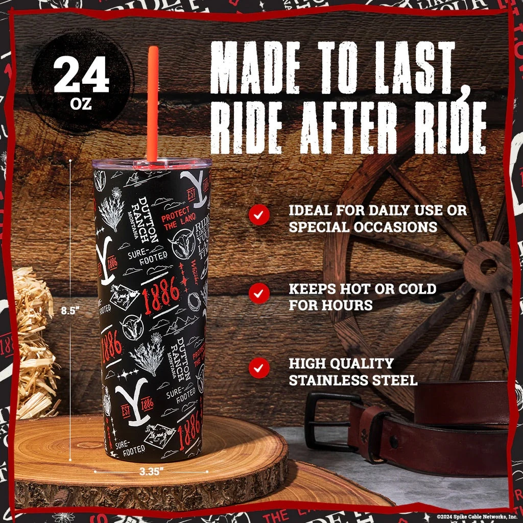 Enjoy your favorite beverages in style with these officially licensed Yellowstone water cup with straw and lid, complete with straws featuring iconic designs from the hit Western TV show. Made from high-quality stainless steel, these travel coffee tumblers utilize double-wall vacuum technology to keep drinks hot or cold for hours and fit perfectly in standard cup holders. They offer a stylish and convenient way to stay hydrated on-the-go, making them ideal for outdoor adventures, office tasks, or any setting. Packaged for easy gifting, these insulated coffee tumblers make perfect presents for Yellowstone fans.