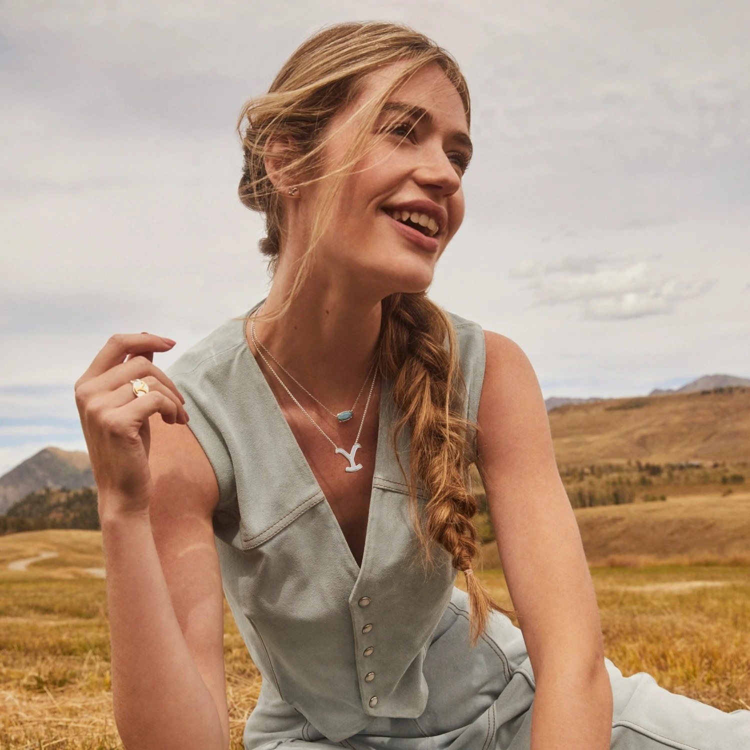 Two legendary figures—the Yellowstone Dutton Ranch™ and our iconic Elisa—have come together for one unforgettable style. The Yellow Rose by Kendra Scott x Yellowstone™ Elisa Short Pendant Necklace is sporting a vintage-inspired frame and makes the perfect everyday accent for those with adventure in their heart. VARIANTS: Silver Ox/Variegated Turquoise Magnesite, Vintage Gold with Silver Ox Accent/Ivory Mother of Pearl, Vintage Gold with Silver Ox Accent/Variegated Turquoise Magnesite