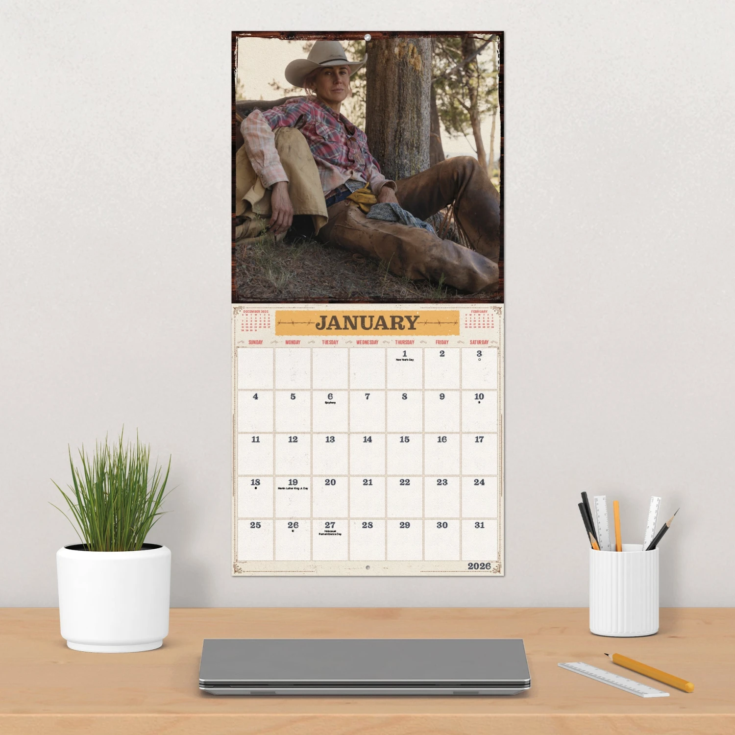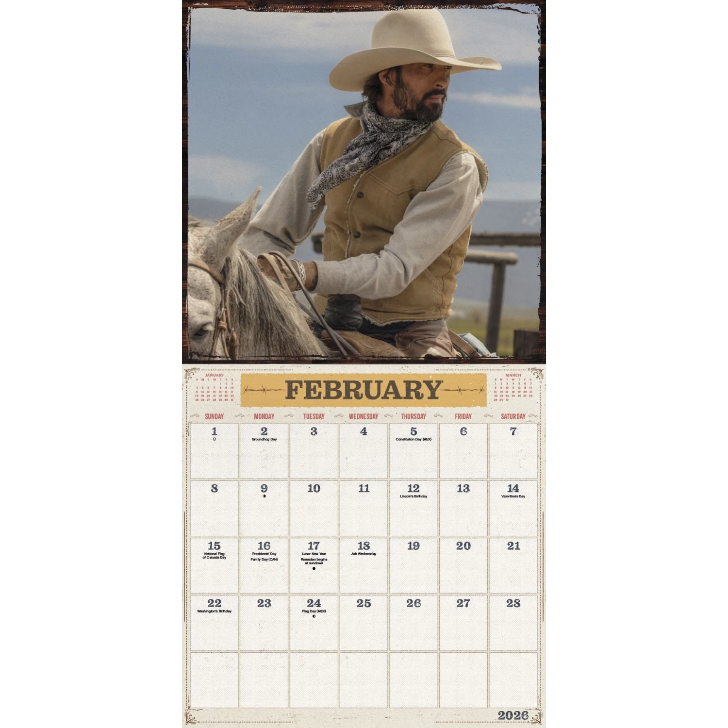 The Dutton family has been ranching their Montana land for six generations with all of the drama and intrigue that entails. Throw in a little politics and an intense — and often violent — border dispute, and you’ll be at home on the Montana range with them in the 2026 Yellowstone: From the Bunkhouse Calendar. Sixteen-month wall calendars feature monthly pages for January to December 2026, as well as a page combining the last four months of 2025. Each monthly page includes federal holidays and moon phases, with sufficient daily blocks for jotting down tasks and appointments to help you stay organized. Features 13 high-quality images printed on premium paper certified by the Forest Stewardship Council. Perfect for hanging on your wall, corkboard or bulletin board at home, school or the office.