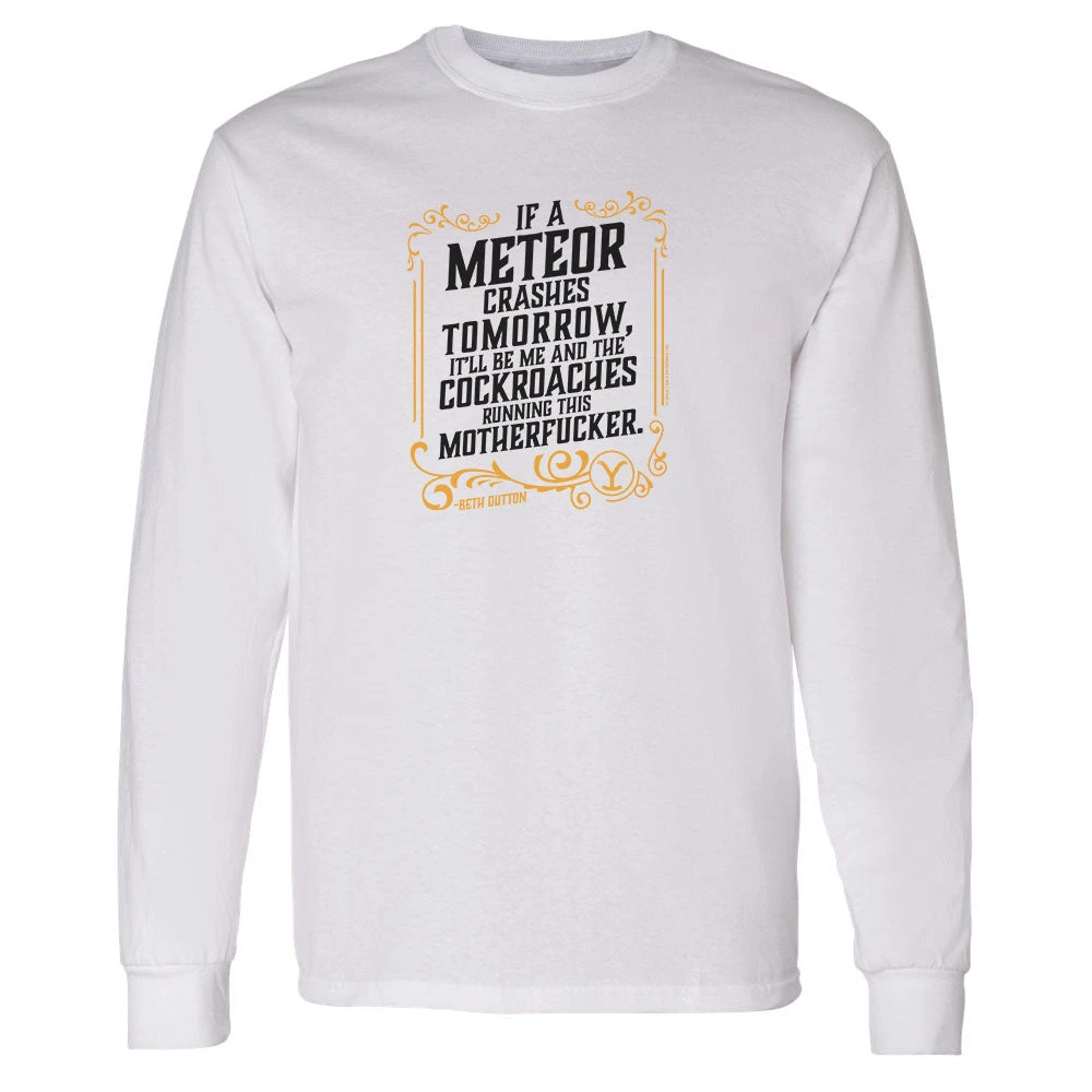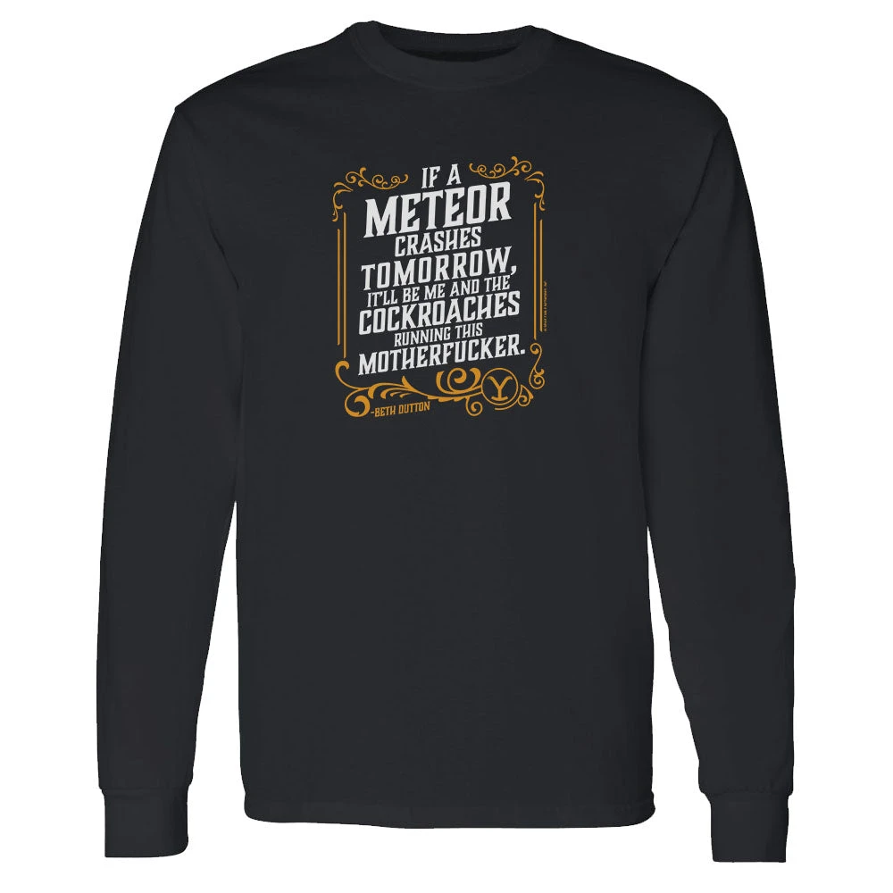 Worry not, daddy. Only the good die young when they wear this Yellowstone If A Meteor Crashes Tomorrow Adult Long Sleeve T-Shirt. Featuring an iconic quote that any Beth Dutton fan will appreciate, this Yellowstone If A Meteor Crashes Tomorrow Adult Long Sleeve T-Shirt is a must-have.