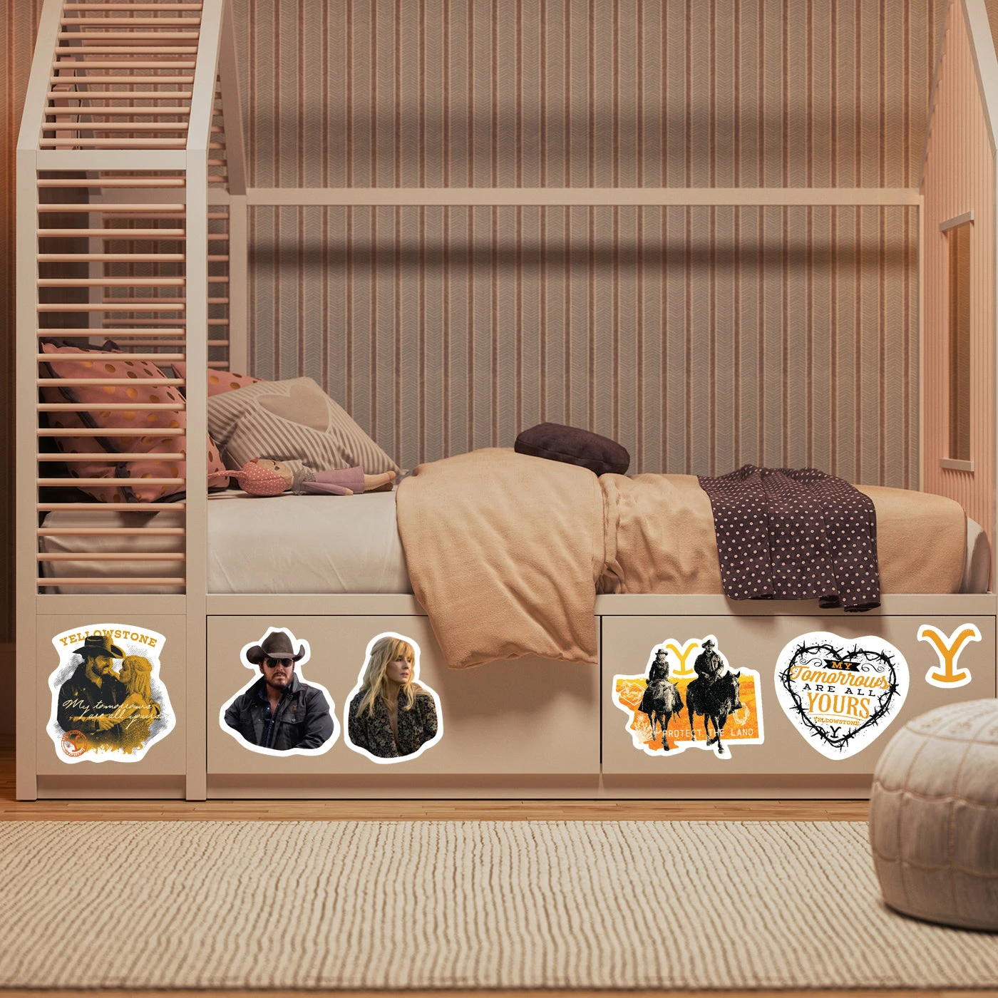 Transform your space with the rugged romance of Yellowstone using the Rip & Beth Wall Decals! Featuring the iconic couple, Rip Wheeler and Beth Dutton, these decals capture the intense love and fiery spirit that define their relationship. Alongside striking images of Rip and Beth, this set includes some of their most memorable quotes, including “My tomorrow’s are all yours,” adding an emotional touch to your decor. Perfect for fans of the hit series, these high-quality, durable decals are easy to apply and remove, making them ideal for bedrooms, living rooms, or offices. Add a touch of Yellowstone’s wild charm and the profound connection between Rip and Beth to your space with these must-have wall decals!