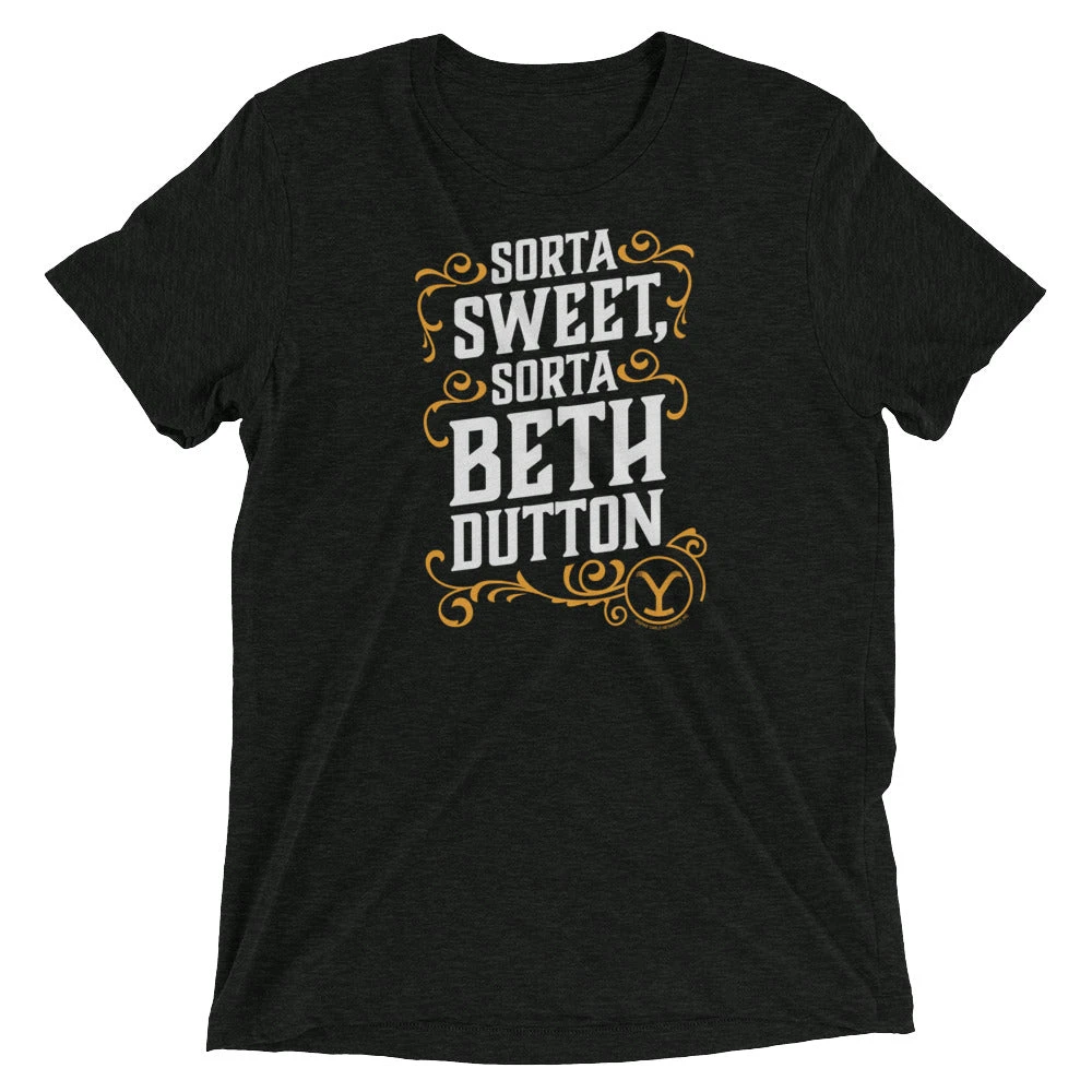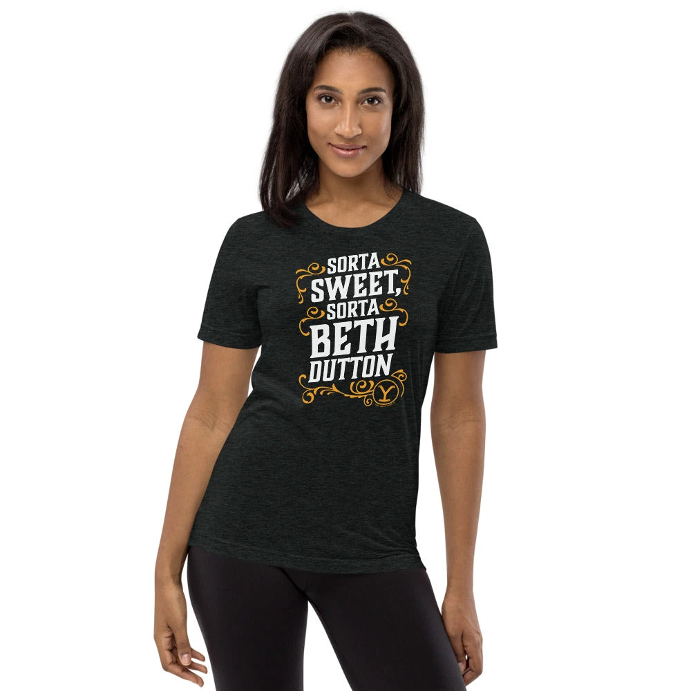 If your personality lands between “sorta sweet” and “sorta Beth Dutton,” then this Yellowstone Sorta Beth Dutton Tri-blend Short Sleeve T-Shirt was made for you. With a comfortable fit and design that will make any Yellowstone fan laugh, this Yellowstone t-shirt is the perfect addition to your style.