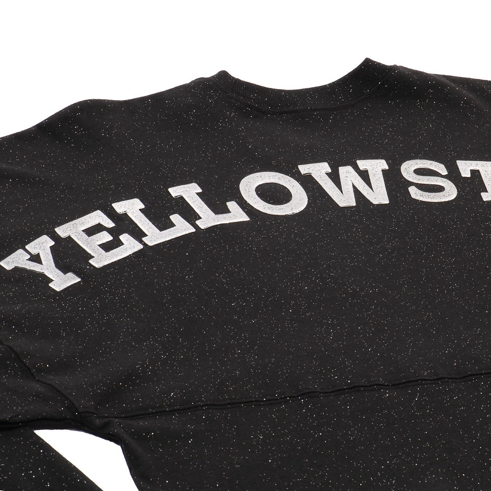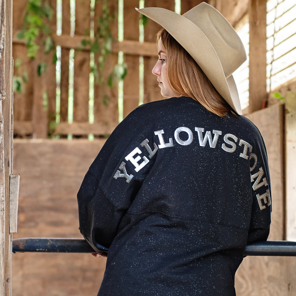 Ride into the world of Yellowstone with our Sparkle Oversized Spirit Jersey, a dazzling homage to the riveting drama and rugged charm of the hit TV series. Crafted for those who find themselves drawn to the magnetic pull of the Yellowstone ranch, this exclusive spirit jersey is a sparkling testament to your love for the show.