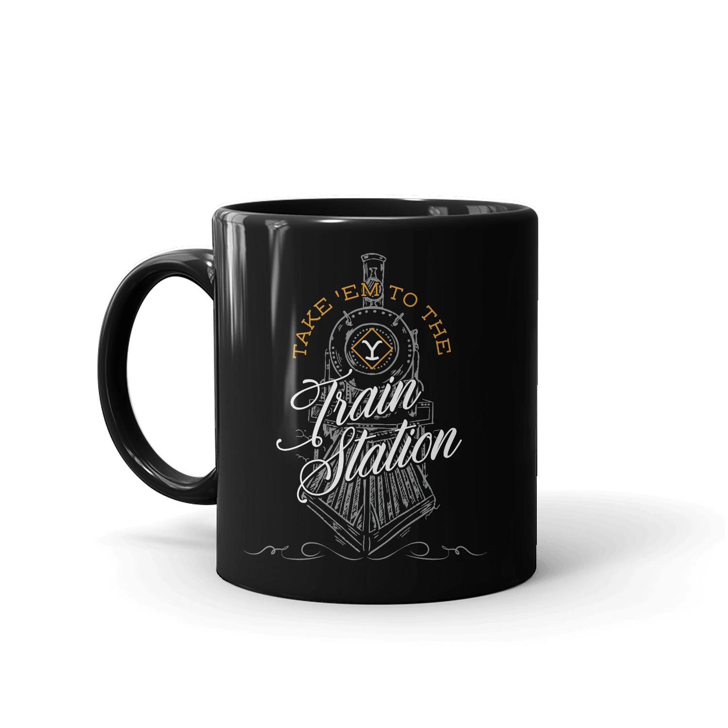 Introducing the Yellowstone Take ‘Em to the Train Station Black Mug – a bold and captivating homage to the intense drama and untamed spirit of the Yellowstone series. Elevate your coffee or tea ritual with this sleek ceramic mug, featuring an iconic phrase that resonates with fans who truly wear the brand.