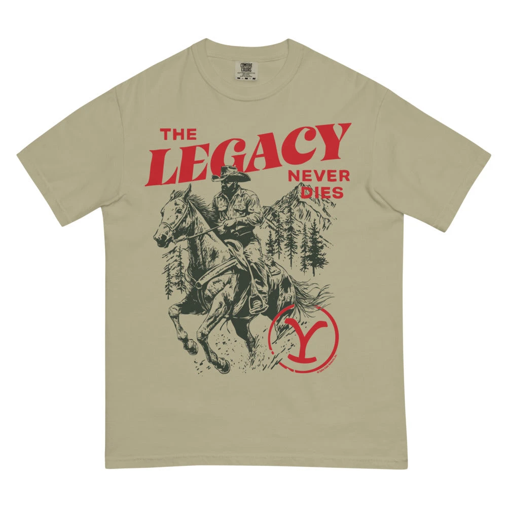 Celebrate the enduring spirit of the Dutton Ranch with the Yellowstone The Legacy Never Dies Unisex Comfort Colors T-Shirt. Featuring bold western-inspired lettering, this rugged yet stylish tee is a must-have for any fan of the hit series. Crafted from 100% ring-spun cotton, the Comfort Colors fabric offers a lived-in feel, relaxed fit, and long-lasting softness that only gets better with every wash.