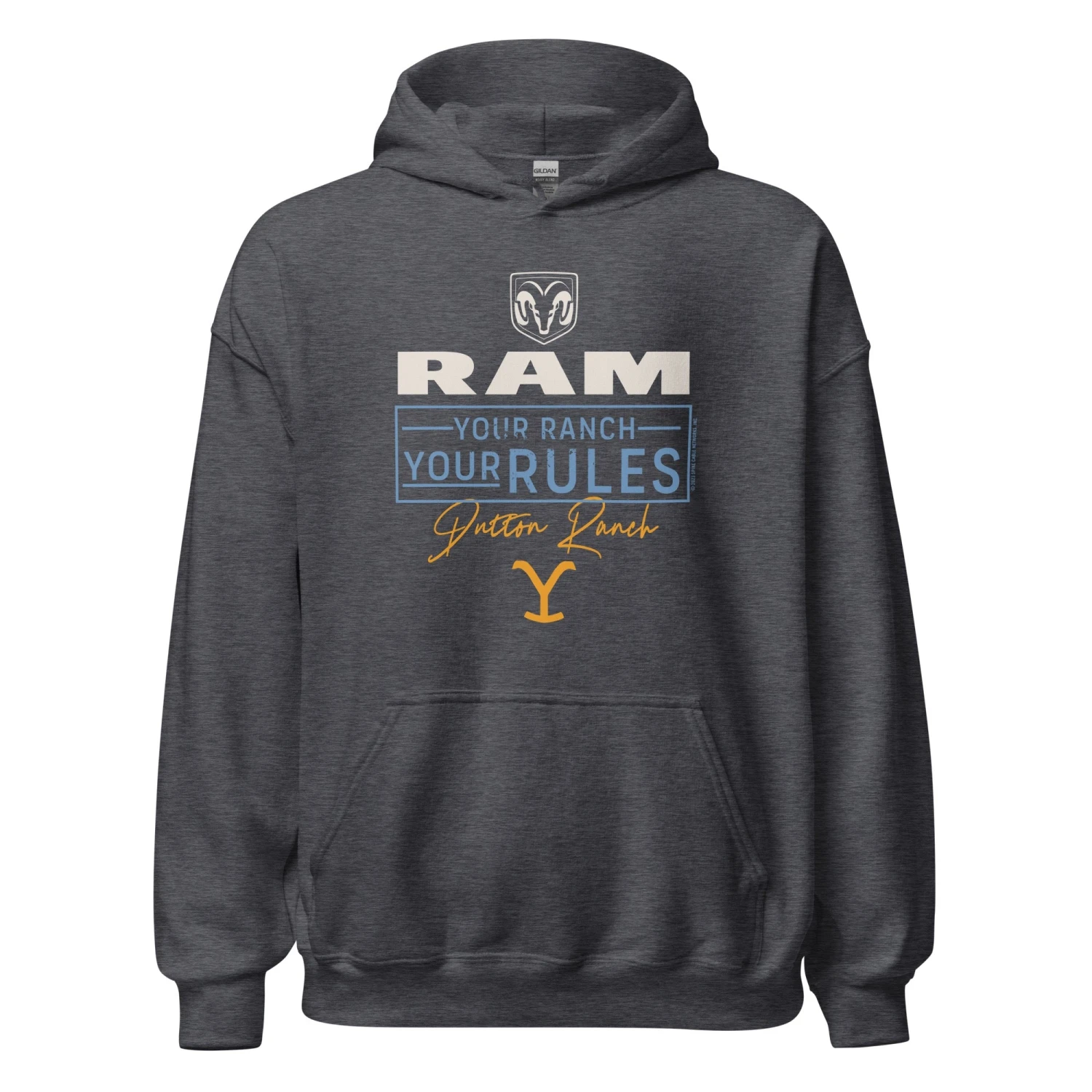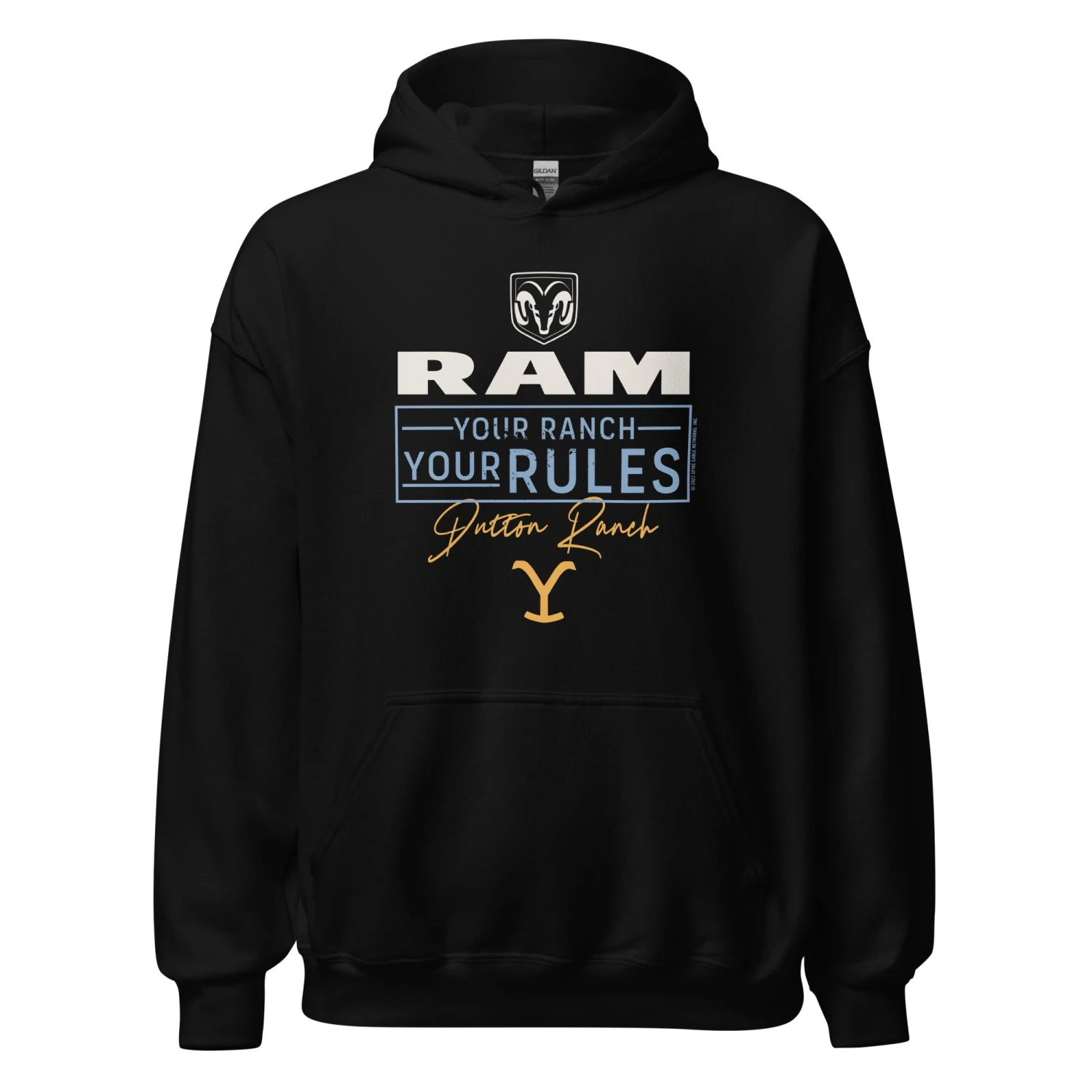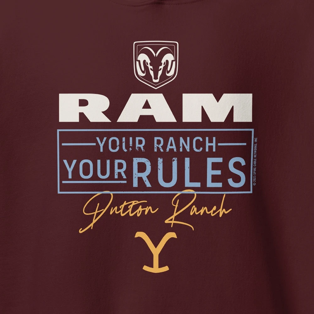 A hoodie that both fans of Yellowstone and Ram can enjoy – the Yellowstone x Ram Truck Your Ranch Your Rules Hoodie. This hoodie features a striking design with the Ram Truck and Yellowstone logos emblazoned on the front, along with the words “Dutton Ranch” to show your support everybody’s favorite ranch.