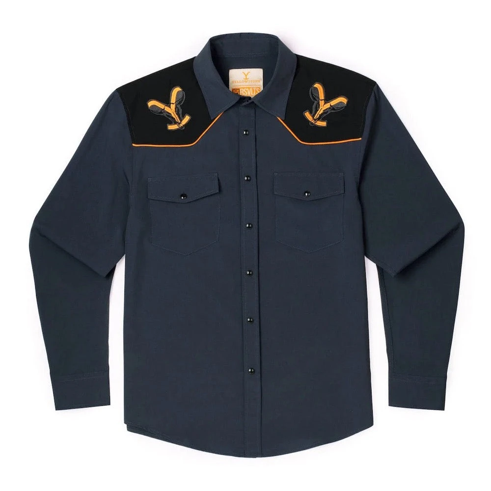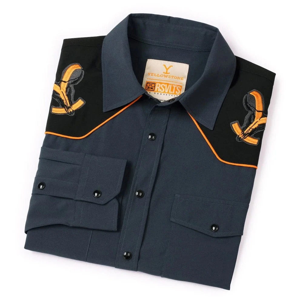 For well over a century, Dutton Ranch has stood for pride, perseverance, prosperity—and pain for those who dare mess with its occupants. Pay homage to the spirit of the rugged American West with this long-sleeve roper-inspired top, which boasts dual pockets, pearl snap summarys, and a pair of badass steer skulls interlocked with Yellowstone’s signature “Y” branding.