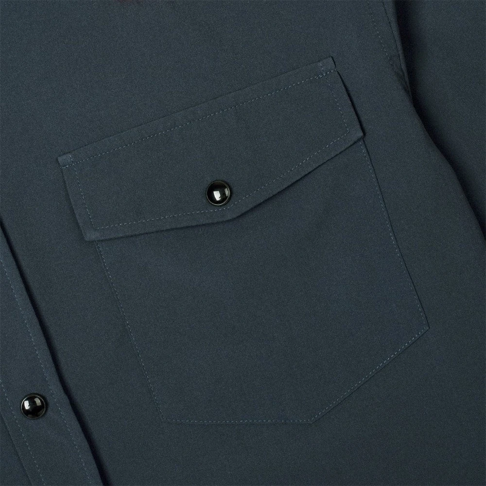- Details: Features two chest pockets and pearl snap summarys down the front
